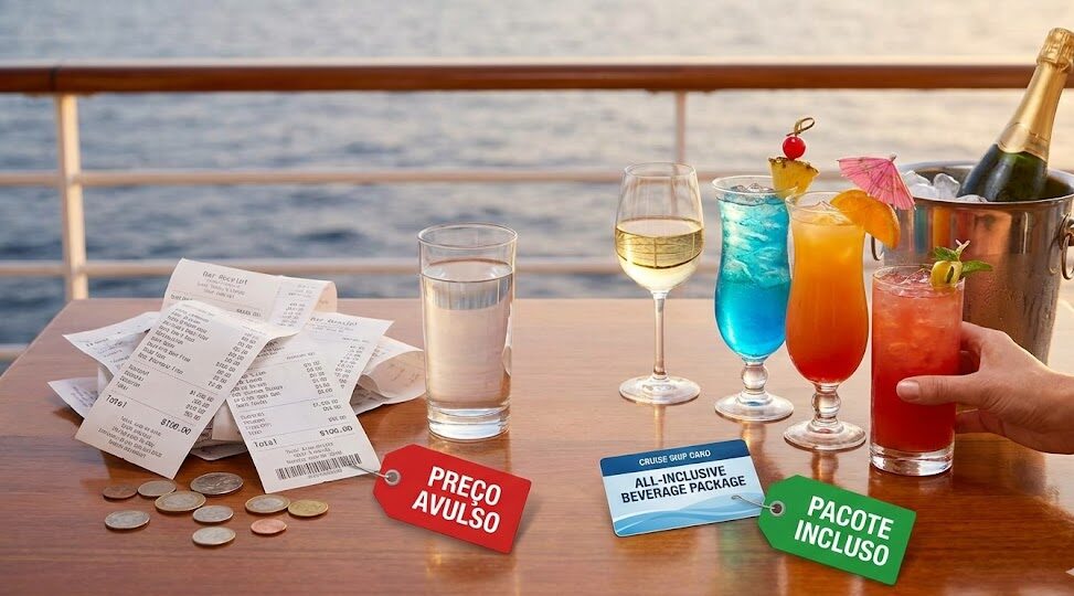 Comprar a bordo é sempre mais caro (e em dólar!). Nossa regra de ouro: se você gosta de vinhos ou drinks, reserve o pacote de bebidas antes de embarcar. Ao usar nossos links de parceiros recomendados, você já visualiza opções com pacotes promocionais inclusos, blindando seu orçamento contra a variação cambial.